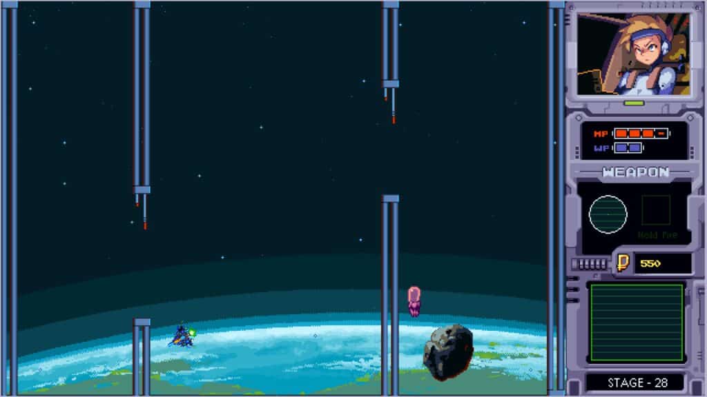 This game is intense and constantly introducing new enemies or hazards to contend with. It can be things like a giant metallic hand floating around, which is both indestructible and quite dangerous if you crash into such an object, or simply the gravitational pull of Earth. I’m not a fan of that gravitational pull gimmick. It would have been cool once or twice, yet it is used too much. This makes the levels feel kind of disjointed as you keep switching from the cold emptiness of space, then suddenly to the same identifiable location. Thankfully, it is still not all that common. The controls are not tight enough to make the constant act of being pulled into the bottom of the screen fun. Especially when they start introducing hazards or the aliens that pull you around, further messing with your movement.