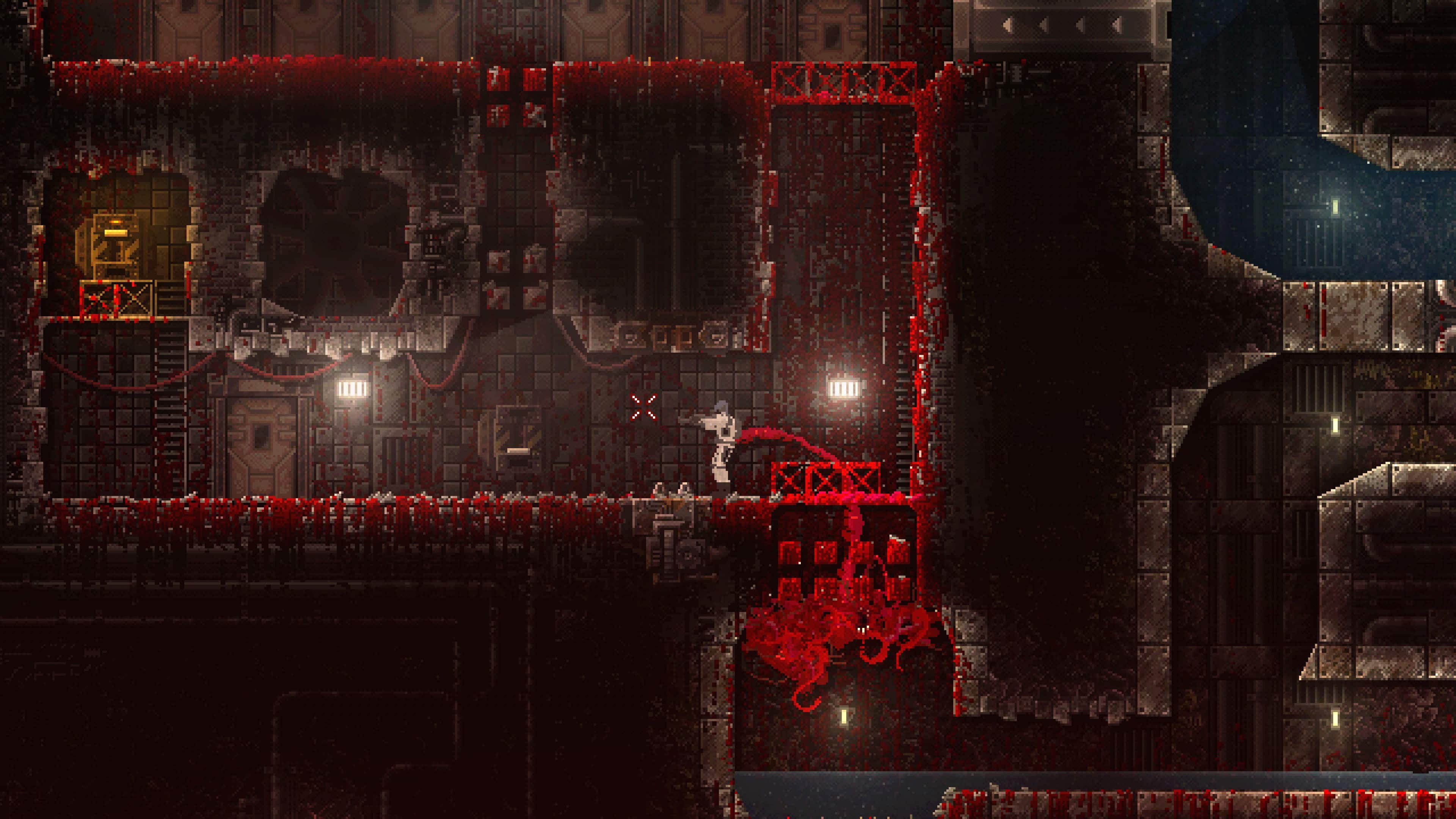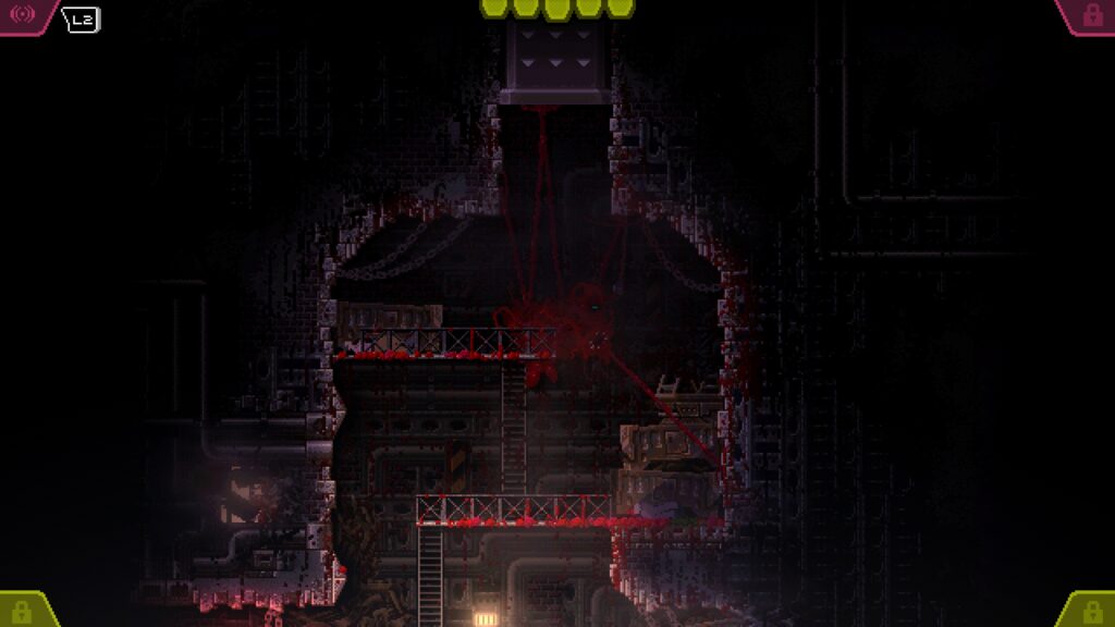 Carrion has all kinds of weird design decisions that at times feel like they are just there to pad the game. Chief among these are the separate abilities in your three size forms. An example being that your first form has an ability to “shoot” a tentacle and pull a lever. The third has one where you can shoot multiple tentacles, which also works to pull larger objects, but won’t work on levers for some reason. Another example is that the second form has a charging attack to move obstacles that is often used alongside the third form’s pulling tentacles. It adds nothing to the gameplay. All it does is force you to needlessly head to a different room with a red pool of water so you can lose mass, go back to use an arbitrary ability, and then come back to regain your mass again. Rarely did it ever serve to improve a puzzle or make you feel like you solved something. It merely invokes the sensation of annoyance when seeing a lever there for the sole purpose of padding.