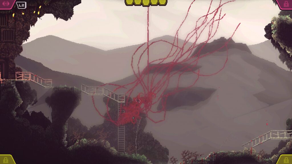 Alongside puzzle-solving, exploration is another key factor to this title. You are never told where to go and are let loose in this semi-open world. There is no map or direction markers to guide your way. Your ultimate objective is always to find a couple of potential infection zones around an area and create a fleshy checkpoint for yourself. It also serves as a save point. Dying will set you back to the last one you made and reset any progress you have gained. They are usually plentiful, so it likely won’t be long before you are back to where you met your untimely death. Finding and infecting all potential infection zones is mandatory, you will need all of them to open a locked vault leading to a new area. Once you slither your way inside, you will find yourself in a new location ready to repeat that process once more.
