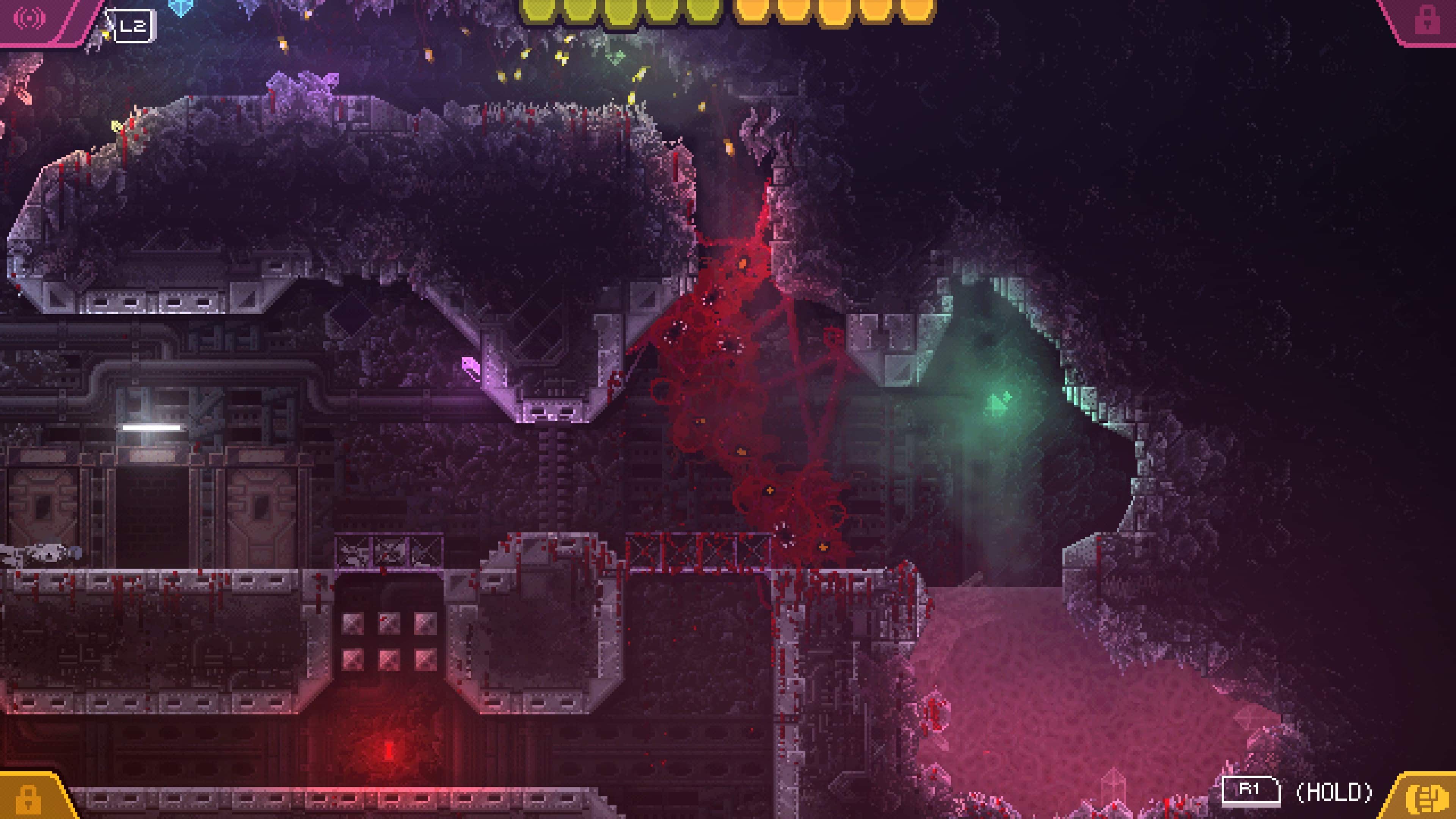 Interestingly enough, all locations are interconnected. Since entering a vault teleports you somewhere else, it is difficult to get a feel for the land, but they all exist in the same space. The level design is really quite good. As maze-like as it is and with the lack of hand-holding, I never found myself feeling lost. It is neat finding yourself in old areas again and making use of your new abilities to pass through into a previously inaccessible room or location. Re-exploring an area for the sake of it can also lead to valuable things, such as DNA that permanently boosts your Energy to further make use of invisibility and other powers. There are no respawning enemies, making for a far more peaceful time once again poking your head into places without the threat of being met with a machine-gun burst to the face. It never ceases to be mesmerizing watching your creature slither about, and the pixel art is just as nice to look at. This would nearly be relaxing if it wasn’t for those wet slapping noises of you moving around and the background hum of the somber soundtrack reminding us of how this place got to be so silent in the first place.