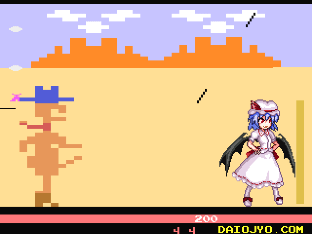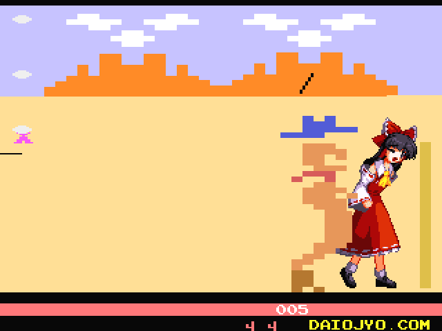 Custer’s Revenge in Gensoukyou is a parody of 1982’s infamous Atari 2600 game that involved Custer having his way with a tied up Native American. Well, he’s back at it again, but with a slight twist. Instead of a Native American, he’ll be after nine different girls from the Touhou franchise. One of the first things you’ll notice if you are familiar with the original title is that the play area is far smaller and the pixel art is somehow worse than that of its 1982 release.