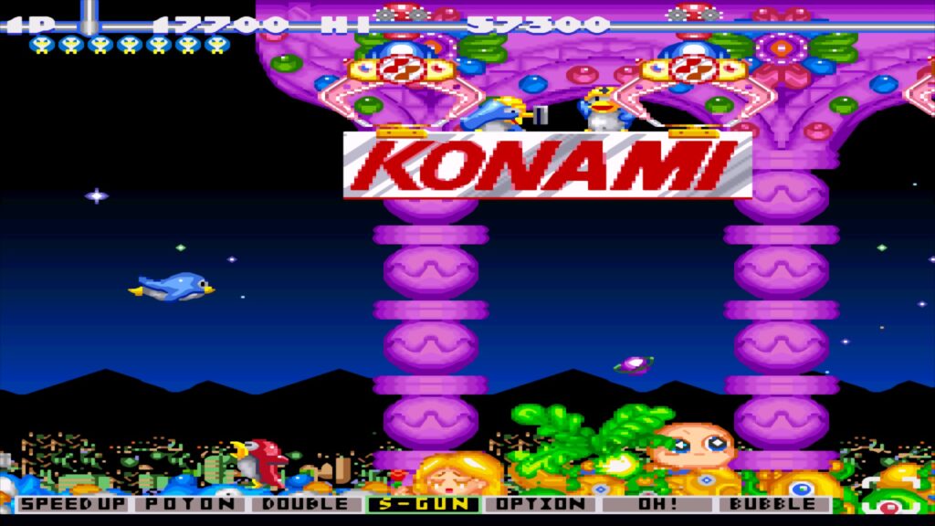 When you actually get into the game you realize how similar it is to Gradius, right down to the power up meter at the bottom of the screen, charged by collecting red orbs from enemies. Soon thereafter you will be shooting down cranes holding stuffed dolls, dancing penguins and fight a boss that is a panda in a tutu. Somehow it manages to get much weirder the further in you go and you can’t help but want to keep playing to be able to see what other crazy stuff is in this game. Even stranger still is that this ends up working very well as you have a game that escapes the space setting of most shmups, has the unique features of Konami’s Gradius series and is just so full of energy and charm. The different characters have slightly different moves like one will shoot missiles straight forward while another drops them down below when you pick the “missile” upgrade. Some have different names like F-Shield or Aura but they work the same, they just have different looks to them like the penguin characters shield is a bubble while the other has a bunny shield. They function exactly the same but it gives the characters their own unique feel and each even have their own death animations.