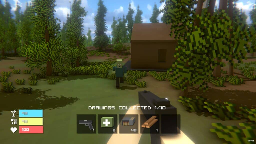 Reeling things back a little, we start off on a poorly made main menu with bizarre tribal music playing. You have a choice of multiple characters to choose from, all containing different gear to begin with. Pick your Minecraft-looking character of choice, and you are off into the wild zombie-filled world. We start off in front of an abandoned shack with quite a peculiar thing inside. That being a giant, floating picture of a stock anime Unity girl in slightly lewd positions. You’d think you just found one of the Ten Commandments in your sacred pilgrimage to rescue all the lewds in this post-apocalyptic world, what with all the unnatural bloom surrounding the thing. This random arse thought of mine is actually quite fitting, considering we actually do have to collect ten of these to win the game.
