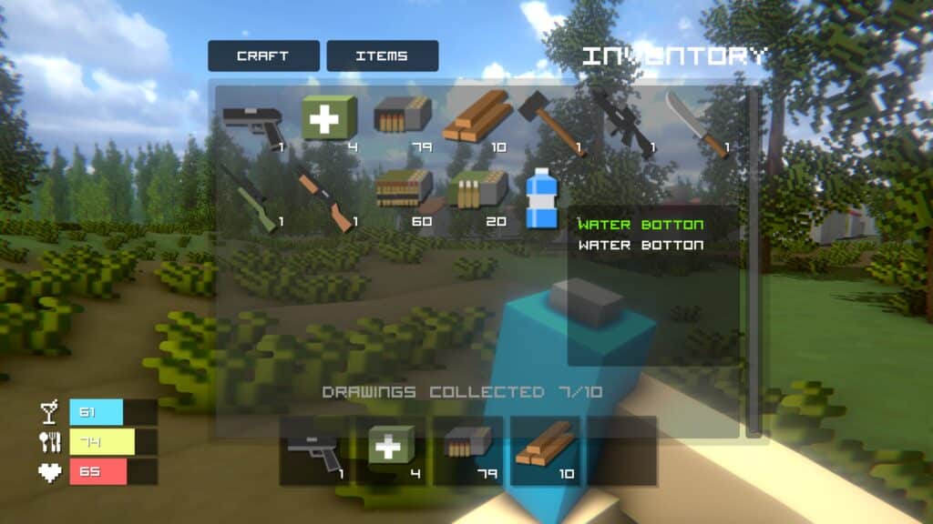 Hey, look, there is a Humvee we can ride in the street! I got in and used it to ram down a zombie. Or at least I tried. The thing got stuck under the vehicle and somehow sent me flying into the stratosphere, which was honestly pretty funny. Starting to have an iota of fun, I decided to leave this tiny city and begin exploring the rest of the map. I was more than disappointed to learn that this title is entirely front-loaded. All of its content is found in that town. The rest of it is mostly empty terrain with the rare shack plopped down. There isn’t even another vehicle. What there is will be a bunch of neatly chopped firewood all over the place to allow you to build a campfire. And do what with it, you say? Buggered if I know. It’s not like the food mechanic works in this game, nor is there a day/night cycle. Fret not though, you can also craft bandages with fabric.. which once again still do not work.