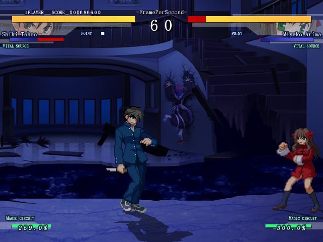 Melty Blood was a Windows exclusive originally released in 2002, two years after the visual novel Tsukihime. Funnily enough, this PC version worked far better on all the Windows 10 computers I’ve tried it on, while it experienced severe texture glitches I could not fix on my Windows 98 machine. As old as it is, it runs near perfectly on modern computers. The only glitch I’ve experienced is that the game would always lock itself to 25 fps on a certain Story Mode scene, effectively more than halving the speed of combat. You will have to get through a fight in that sluggish manner as to save after where it occurs and restart the game to fix it.