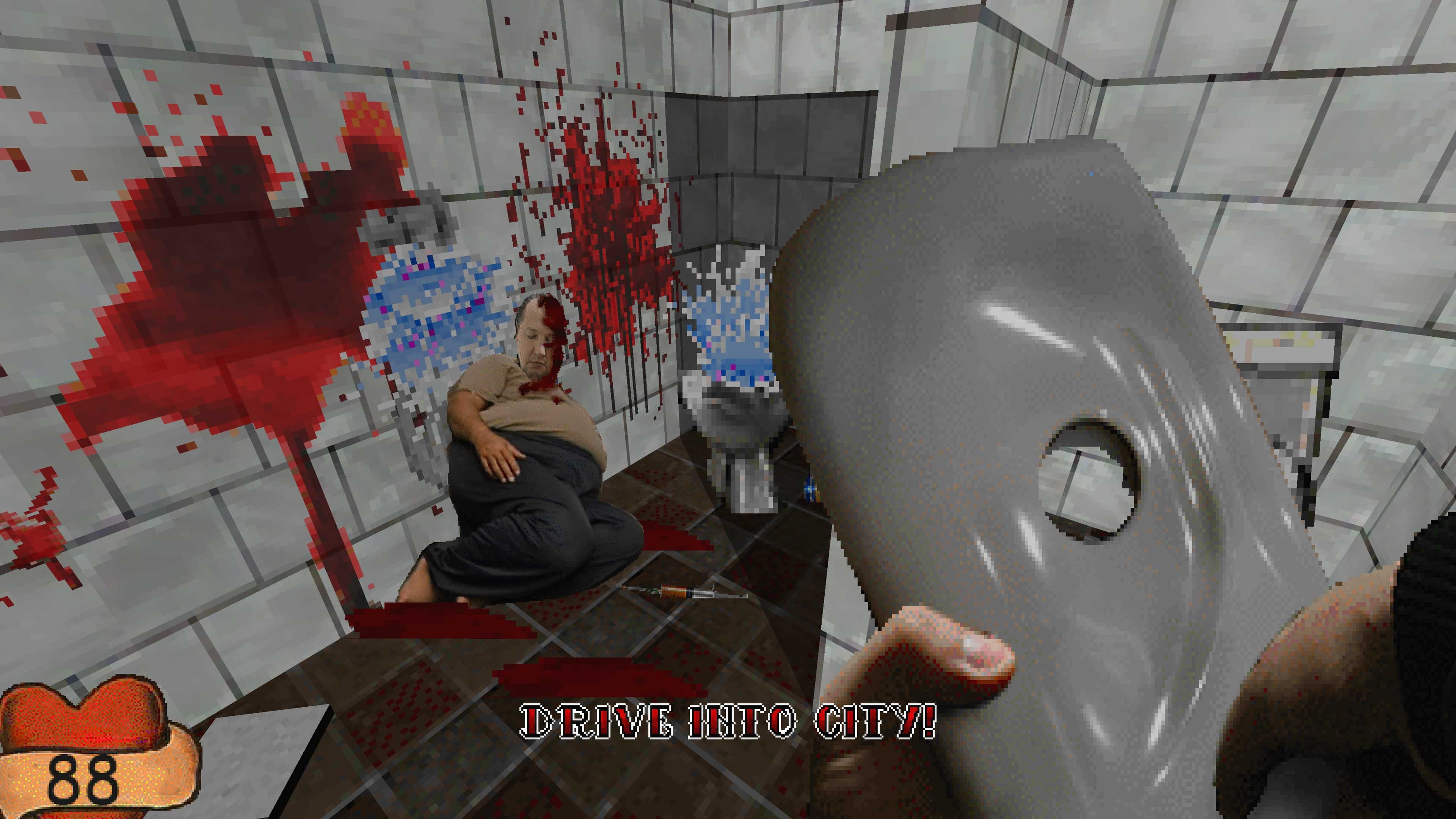 Starting off, you will hear some noises and the game suddenly comes into view. There you are standing in front of a dying obese person with a toilet lid in your hands. It doesn’t take a genius to figure out what happened here and you are tasked with getting right out of there and into a nearby city. You can either try to sneak out of there from the vents or run out swinging at everyone in that gas station. The level design usually allows for multiple approaches and is quite decent all throughout. I’m not entirely sure if it is like Postal 2 where you can avoid hurting everybody if you choose to play that way, but I never found a situation where I couldn’t just run away or let the friendly AI handle it aside from the last boss fight.