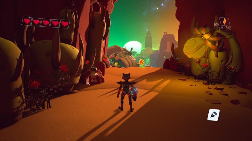 As you crash-land onto the island, you will immediately encounter your new owl partner Plux who will now accompany you throughout the rest of the game. Plux is a chatty character while Skylar herself is a mute whose robotic AI arm does all the talking. This island you now find yourself in is an incredibly beautiful place as is every other area you will explore. The title is powered by the Unreal 4 Engine, and they really nailed the whimsical look while still looking visually impressive. It is full of color, stylish and more importantly, the level design is great with it never being unclear where you should head to head to next.