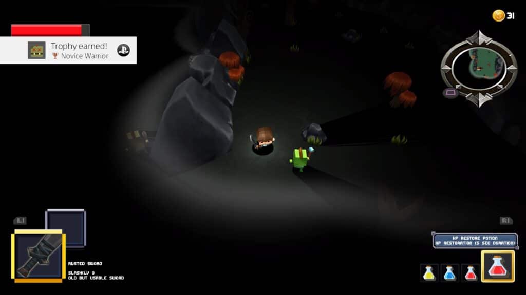 The controls are rather simple and you’ll find yourself slaying scores of baddies in no time. You use the left analog stick to move and the right one to attack in whichever direction you choose. On top of that, you have a slot for another weapon, granted you find one, and are able to carry around four potions at any given time. Your first enemies you encounter will take only a few hits to go down, even with that crummy sword we were given. Not to mention that you slowly regenerate health, so even the foes that fling projectiles are of little threat. What will typically spell your defeat is not one single battle, but the constant wear and tear you’ll receive from the infinitely respawning hordes. Rare is the moment where you are not whacking something outside the head, with even previously explored areas cropping up a wide variety of nasty surprises as soon as you take your eye off it.