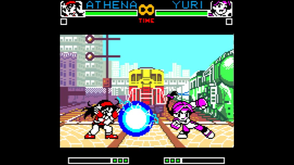 You only have one button to kick and another to punch, but it still manages to be an in-depth fighter with plenty to learn about. The graphics look nice with each character being instantly recognizable in their cute chibi form, and it runs perfectly smooth, having no slow down whatsoever. It is extremely fluid, responsive and the amazing DPad on the Pocket will allow you to easily control what you are doing. Every stage is from KoF 98, and there are six to fight in overall. They look pretty good all things considered. There are thick black bars on both the top and bottom of the screen to better allow you to see the meters. It was also likely done to render less of the play area and in turn, make the game run better.