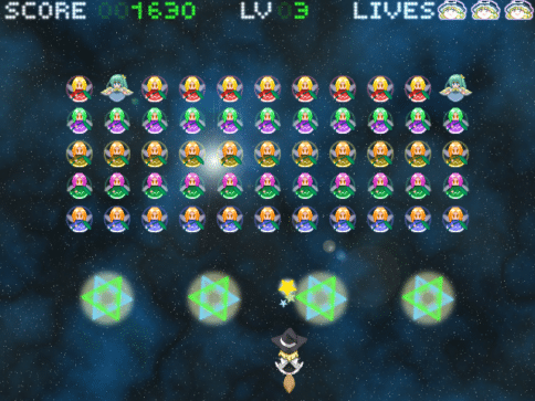 Toho Invaders is a parody game of 1978’s legendary title known as Space Invaders. We pick as one of two characters whose only differences are aesthetically and off we go to shoot anime girls riding in UFOs. There are quite a few of them, all slowly but surely making their way down the screen. They will also occasionally fire a projectile your way to keep you on your toes. Overall they are nothing to worry about until they start nearing in on your four spell shields that separate you from them. If they so much as touch one, it is an instant game over.